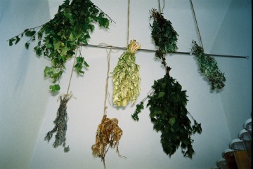 Ale asi bych vypíchla jednu věc, a to je tenhle závěsný systém na bylinky. Já jsem totiž vždycky chtěla mít kuchyni jako má Bohdalka ve filmu od Ester Krumbachový Vražda ing. Čerta. Má tam všude zavěšenou cibuli, sušený byliny a měděný nádobí, sen. Hrozně dlouho jsem to chtěla a nenapadlo mě, že bych to mohla udělat tady. Ale pak si říkám, tady v tom úzkým místě je fakt vysokej strop, vždyť já tam můžu dát takový ty rozpěrný tyče do koupelny. A bylo to.